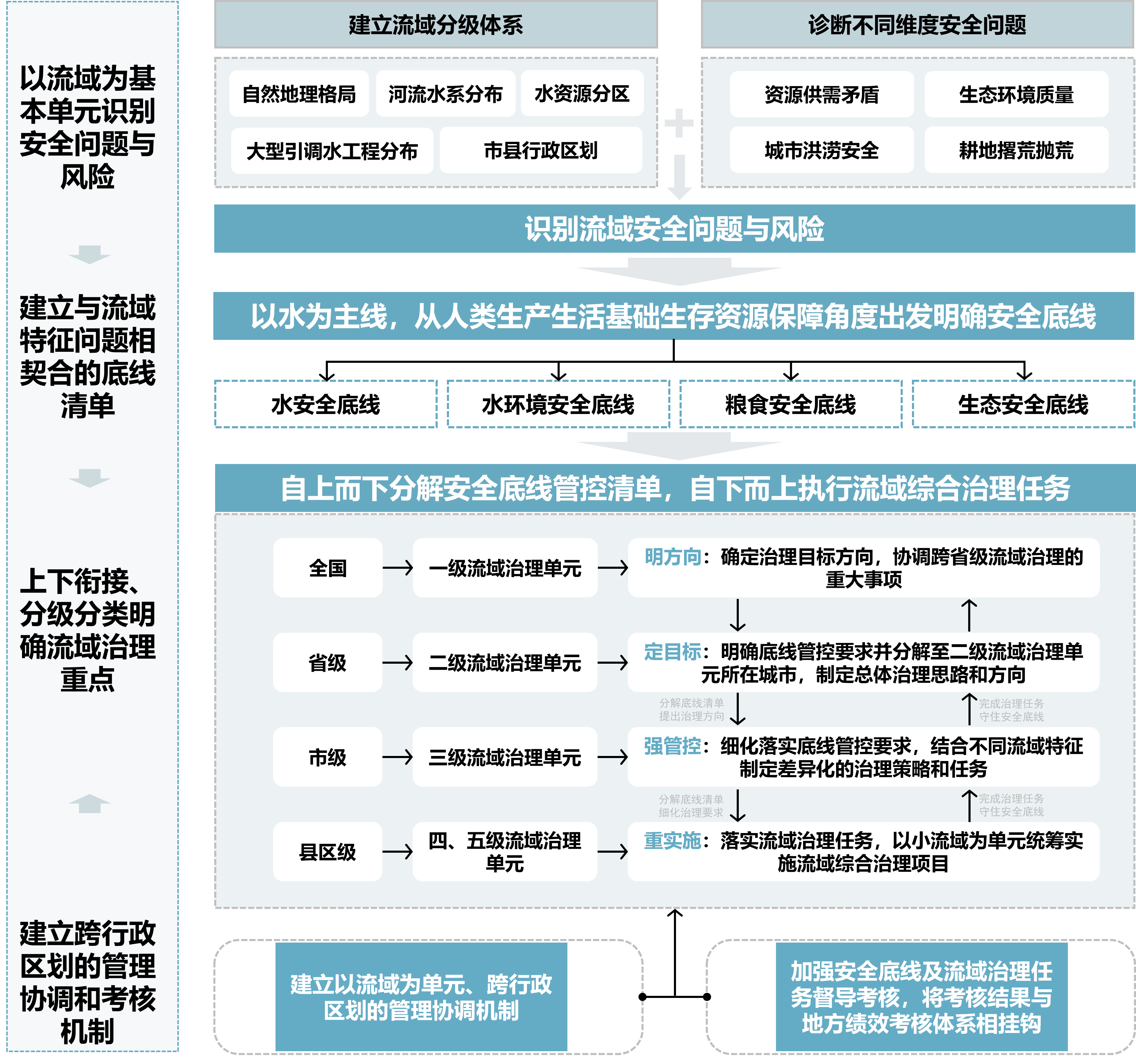 以建设全国构建新发展格局先行区为目标,确立“三个统筹”总体技术思路:统筹高水平安全与高质量发展,破解安全风险高、水环境压力大等问题;统筹城乡区域与资源环境协调发展,优化“三生”空间布局,缓解发展不平衡矛盾;统筹国内国际两个市场两种资源,依托区位与科教优势,打通经济循环堵点。在此基础上,构建“现状认知-总体目标-底线管控-发展指引-支撑体系-空间布局-实施传导”技术框架,将全省划分为3个一级、16个二级流域片区,明确水安全、水环境、粮食、生态四类安全底线及治理要求;守护自然生态格局,构筑“三大都市圈+三大发展带”空间格局;完善综合交通、现代物流等四类支撑体系,为双循环发展提供有力支撑。