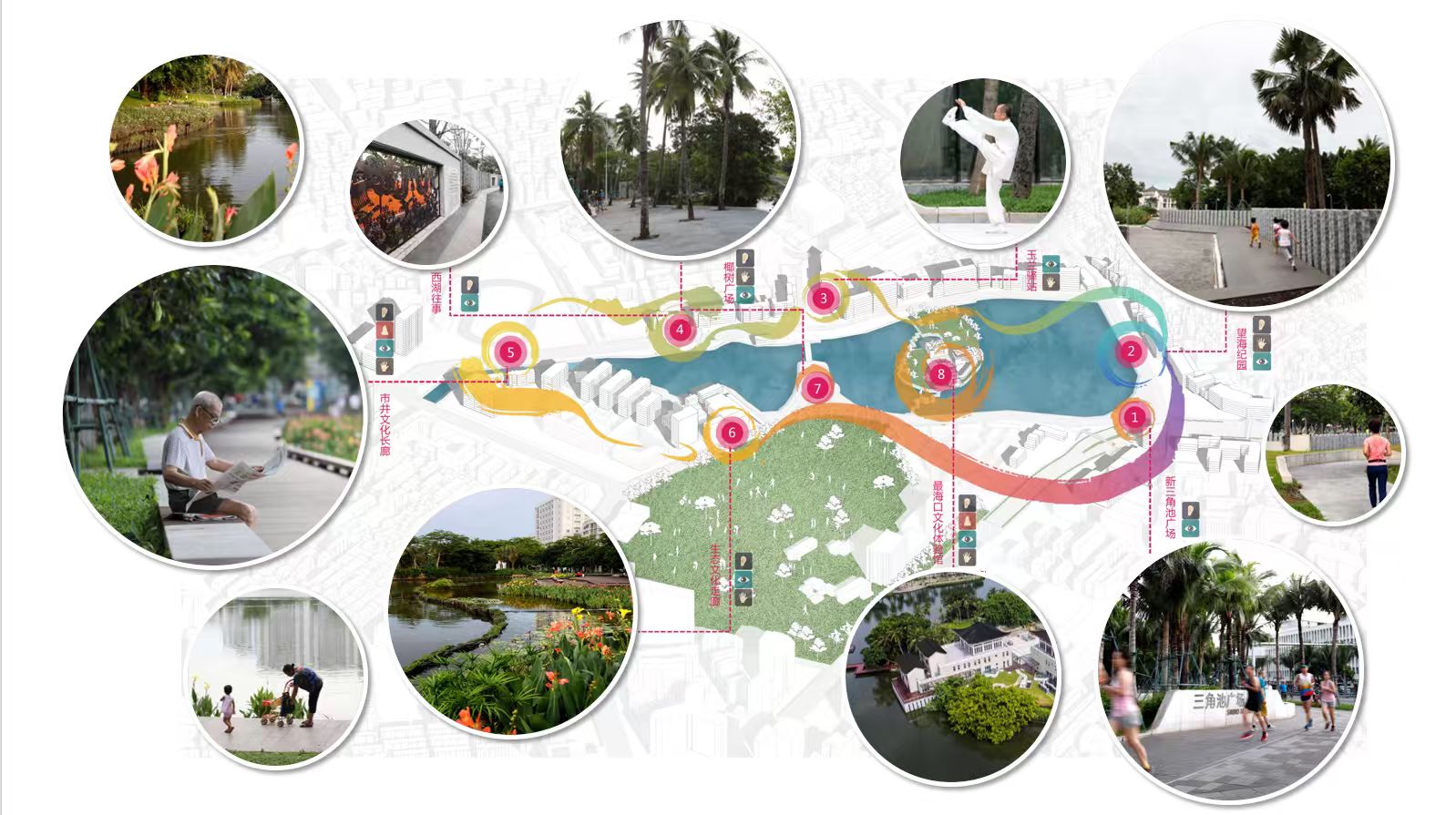 规划设计坚持目标、问题双导向原则。目标导向,依托于三角池片区优越的环境资源、特殊的文脉积淀、市民及闯海人的情感认同,描绘“最海口”发展愿景。问题导向,针对三角池面临的现实困境,提出重铸文化认同、重塑空间场所、重整生态本底、重织交通网络、重补优质服务、重理社会善治六重策略,综合性、系统性、针对性地解决实际问题。