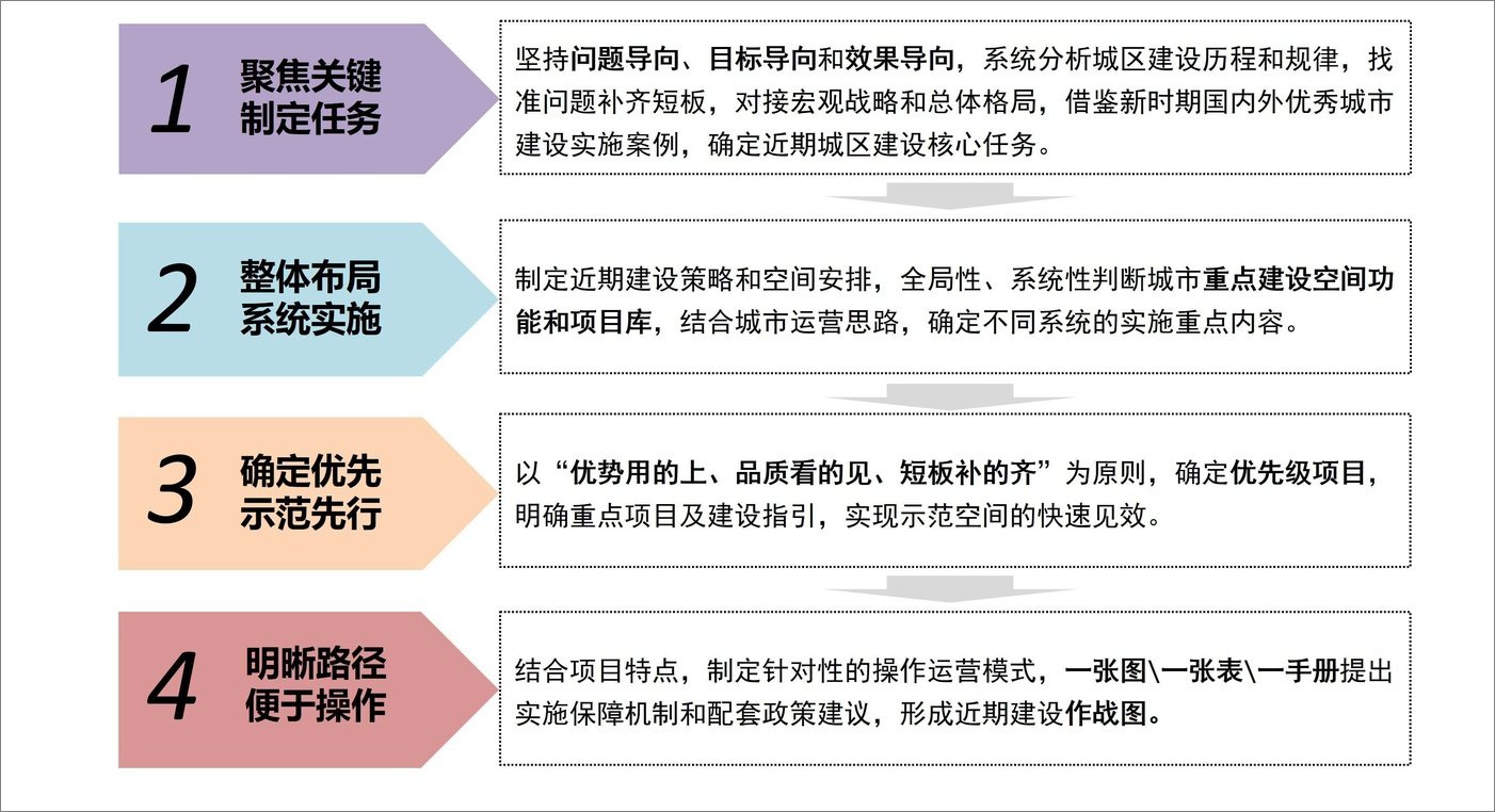 《纲要》系统评估了鞍山城市建设发展基础与形势,确定近期重点围绕“产业转型、城市转型、社会治理转型”三大领域,提出以促进城市“新旧动能转换”“宜居品质提升”和“存量资产升值”为突破口,构建了“建设评估为基础、空间价值为引领、城市设计总统筹、行动计划为抓手、政策机制为保障”的规划方法。通过“成本影响度、品质潜力度、民生迫切度、政策支持度”四个维度对空间价值进行综合评价,确定“低成本、高品质、补短板、落政策”的重点区域。通过确定土地开发和更新的优先级,锁定各个区最具示范意义和最紧迫实施的战略价值空间,带动城区整体建设提升。
