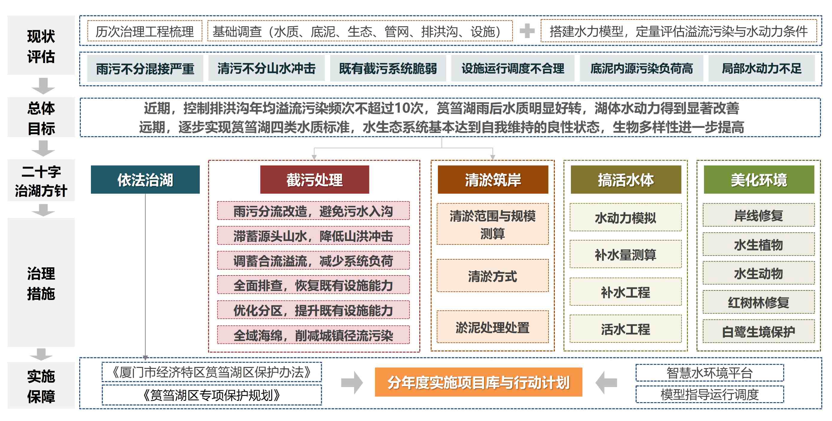 多项重点工程已基本完工,雨天溢流污染明显改善,湖体水生态持续好转;方案内容纳入湖区保护立法及专项规划,提供坚实技术依据;建立“方案编制-落地实施-跟踪服务”全过程动态反馈模式,为筼筜湖打造生态文明实践样本提供有力支撑。