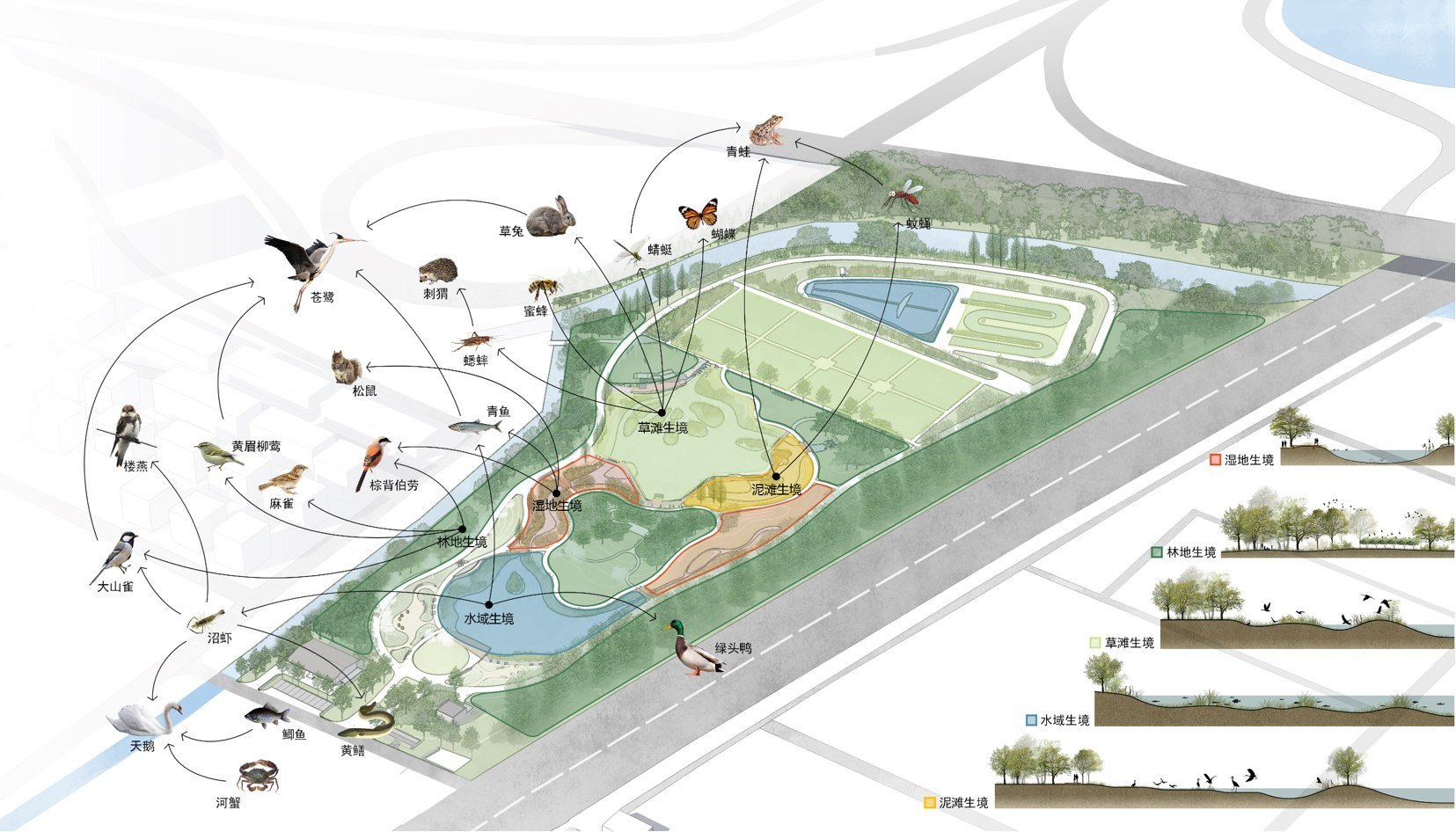 项目采用基于自然解决方案的综合治理路径:一是恢复湿地水网,营建适宜本地动植物栖息的生境;二是构建“生态滞留塘—挺水植物塘—湿地湖区”三级弹性调蓄空间,实现旱涝功能转换;三是组合水平潜流与表流湿地,设计日处理再生水2000立方米,并设置多种运行模式以应对水质波动;四是将生态净化、雨洪管理融入游憩与科普体系,打造兼具休闲、教育与生态服务功能的活力空间。